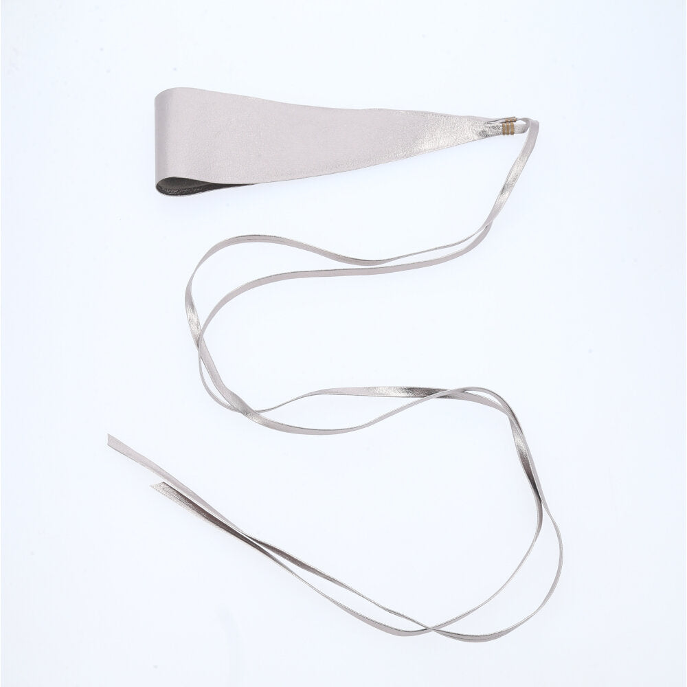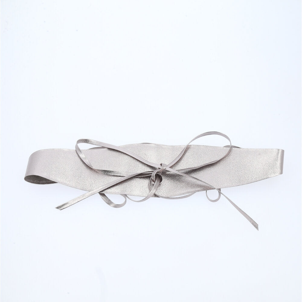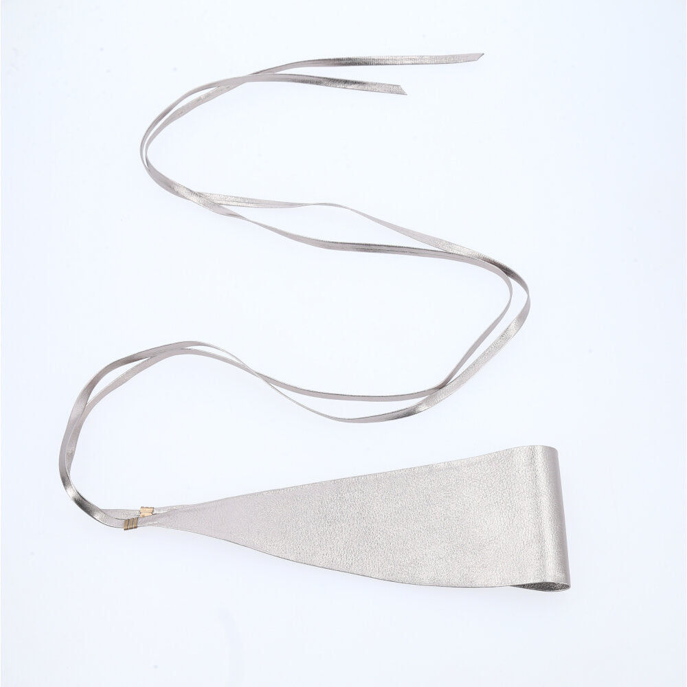 O cinto faixa feminino é confeccionado em couro metalizado, possui fechamento em tiras para amarração.
