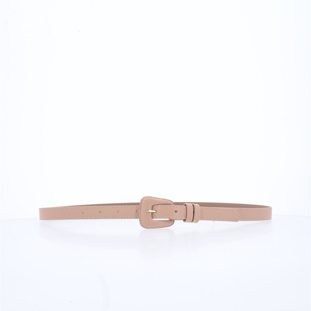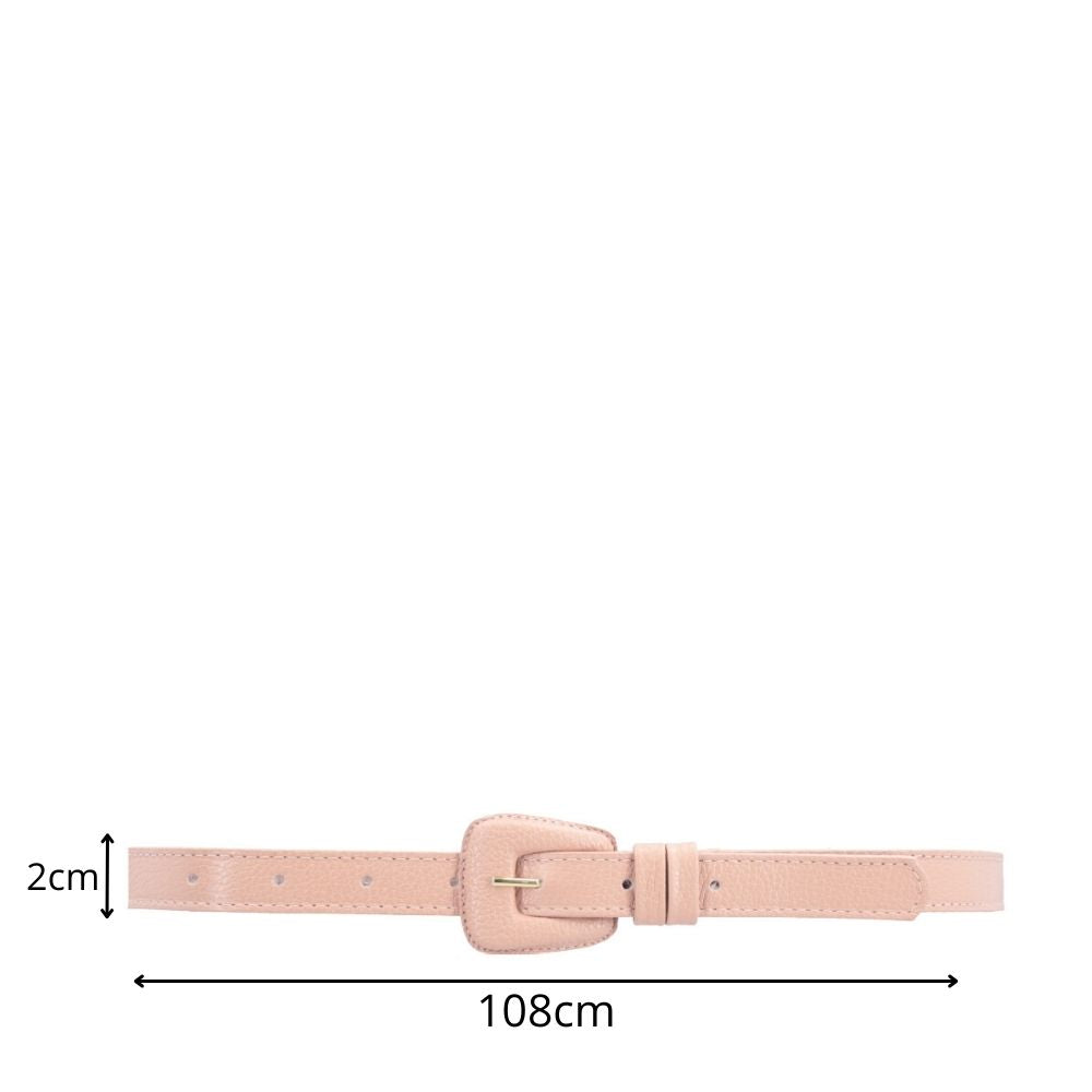 O cinto é confeccionado em couro. Possui fivela encapada, passante fixo encapado em couro e fechamento em pino de metal no banho dourado.