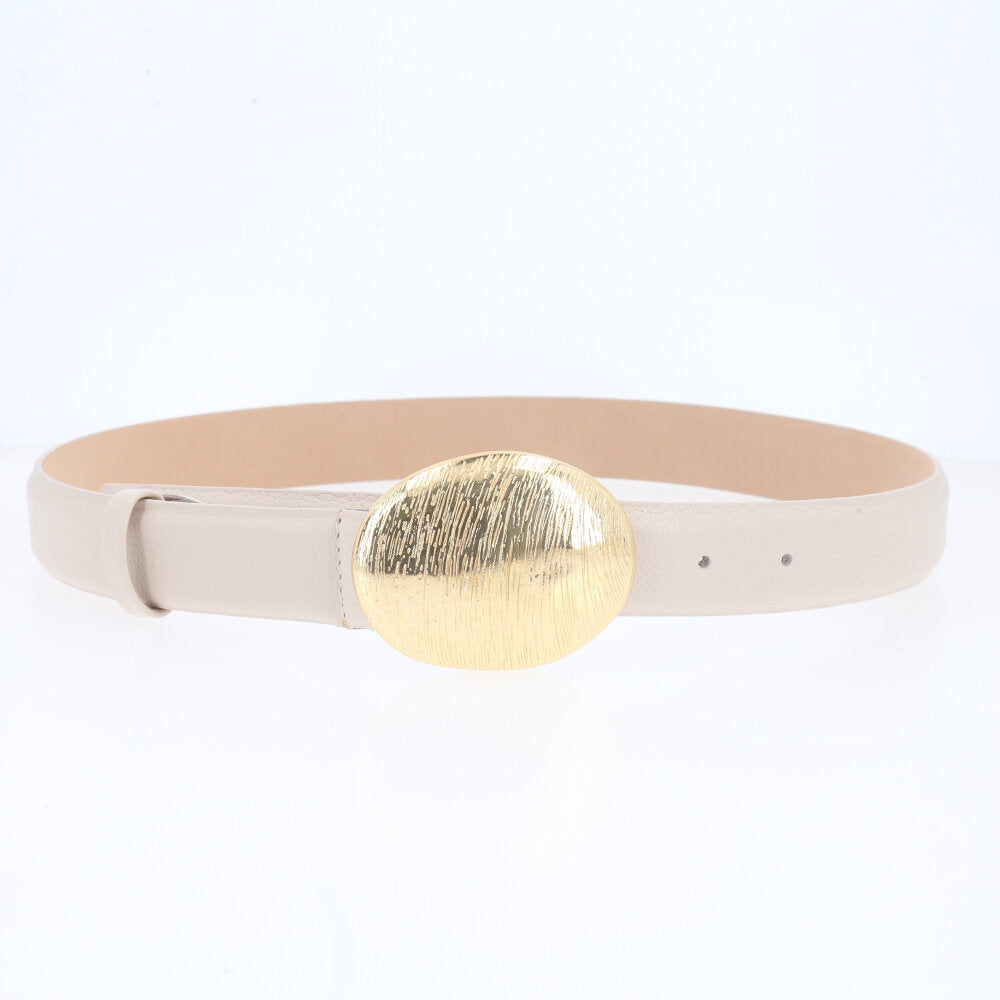 Cinto em Couro com Fivela Oval Metálica Marfim