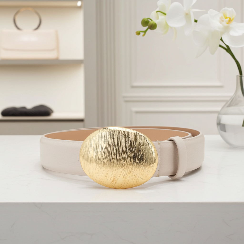 Cinto Feminino em Couro com Fivela Oval Metálica Dourada – Elegante e Versátil